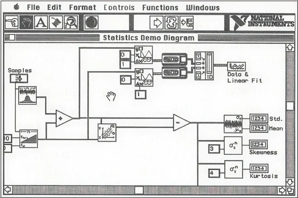 Con LabVIEW, la programación dio un giro visual. Creada por National Instruments en 1986, permitía construir programas uniendo bloques funcionales mediante líneas que representaban el flujo de datos. No había que escribir código, sino dibujar la lógica. Esto permitió ver cómo la información se movía y respondía en tiempo real, convirtiendo el algoritmo en algo tangible y manipulable, y haciendo la programación más intuitiva para ingenieros acostumbrados a trabajar con diagramas.